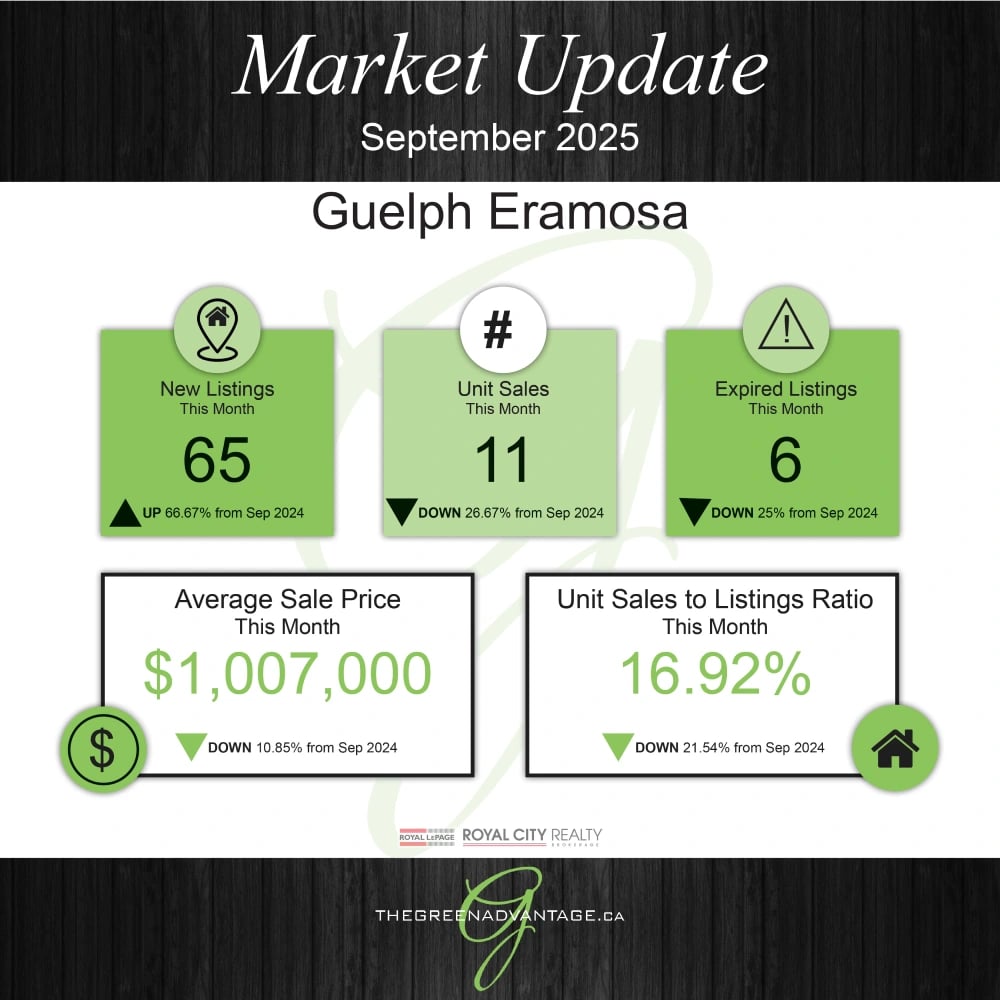 The real estate market in Guelph/Eramosa shifted further into buyer’s territory in September, as declining prices paired with rising inventory. The median sale price fell 7.83% to $999,999, while the average dropped 10.85% to $1,007,000. Sales volume contracted 34.63% to $11.08M, reflecting a 26.67% decline in unit sales to 11 transactions. At the same time, new listings surged 66.67% to 65, while expired listings eased 25% to 6. With a unit sales-to-listings ratio of just 16.92%, the market remains firmly buyer-leaning, providing purchasers with greater selection and leverage at the negotiation table.